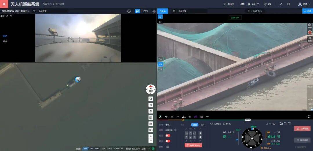 相较于传统水面巡航,无人机巡查具备三大核心优势:一是立体覆盖无死角,可突破水面视角限制,对重点水域、隐蔽航段实现全方位排查,杜绝“钻空子”的可能;二是机动高效省时效,能快速穿梭于辖区水域,精准捕捉船舶吃水异常等超载关键信号,大幅提升执法排查效率;三是全视角取证更精准,凭借高清成像能力固定违法证据,为后续核查处置提供坚实支撑。此外通过科学划分巡查区域、优化巡查频次、明确联动流程,将无人机与水面执法力量深度融合,泰州靖江海事处还形成了“空中巡查发现—实时锁定跟踪—水面力量核查—就近强制减载处置”的闭环执法模式。