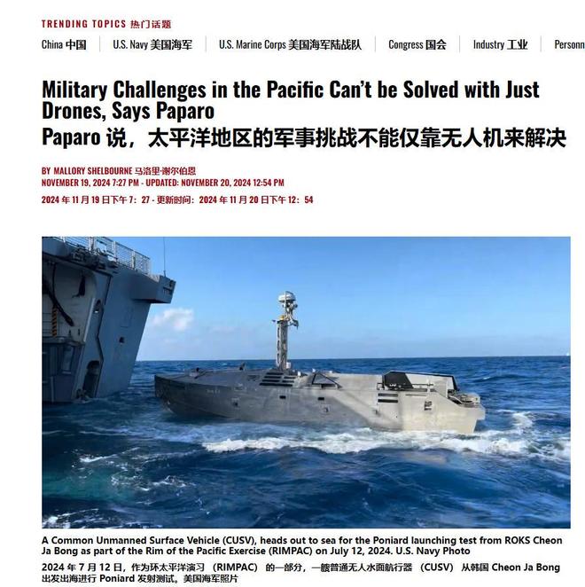 帕帕罗说,要想应对太平洋地区的军事挑战,美军不能指望仅仅依靠无人兵器。虽然美军是可以在狭小空间内使用小型无人机来应对部分威胁,但在更为辽阔的茫茫太平洋上,万一美国和东大之间真的出现了什么擦枪走火的情况,美军仍然需要依靠传统的大型有人操作武器,比如航母、驱逐舰和舰载机等,来与对手争夺空中和海上优势。