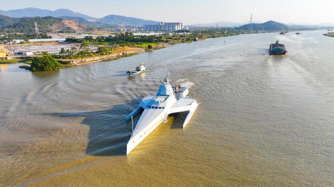 “虎鲸”号无人作战艇采用三体船体设计,造型异常科幻吸睛。这种前卫的船体设计不仅能够显著提升 “虎鲸”号的隐身性能,而且对其航行性能也大有帮助。