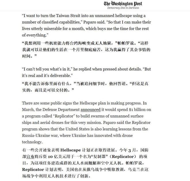 2024年6月10日,美国媒体《》曾在他们的评论专栏上刊登过一篇无人机专题文章,重点讲述了美国军方旨在在中国家门口——尤其是在台海附近“搞搞震”的一个搅屎计划,美国印太司令部司令塞缪尔·帕帕罗(Samuel Paparo)将其称为“地狱景观”(Hellscape)计划。