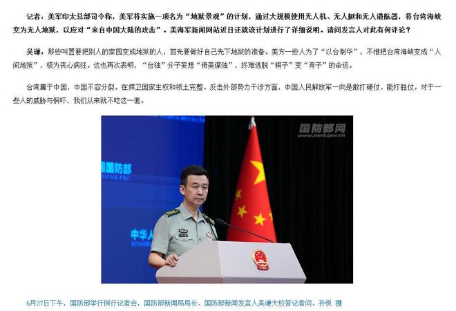 6月27日,在当天举行的中国国防部例行记者会上,有记者在提问环节提到了《》的这篇评论文章,以及文章所援引的帕帕罗那个“地狱景观”计划,还说美海军新闻网站近日还就该计划进行了详细说明,他想知道我们有何评论。