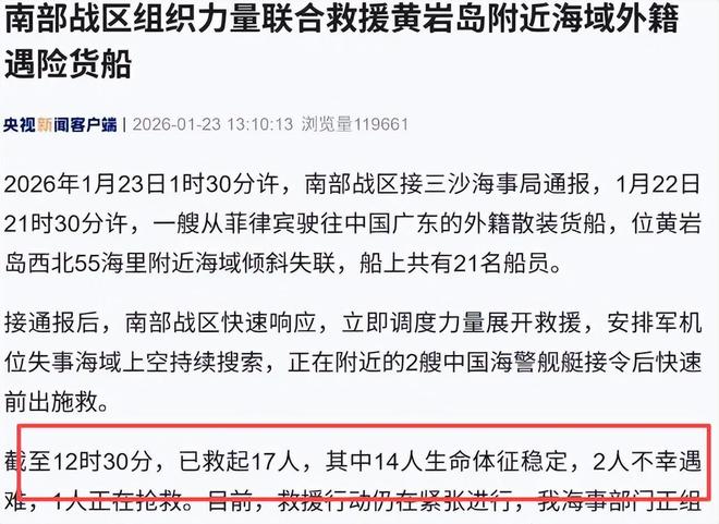 截至次日傍晚,17名船员被成功救起,遗憾的是2人已无生命体征,仍有4人下落不明。这场在风高浪急中展开的救援,用行动划清了人道主义与政治算计的界限。